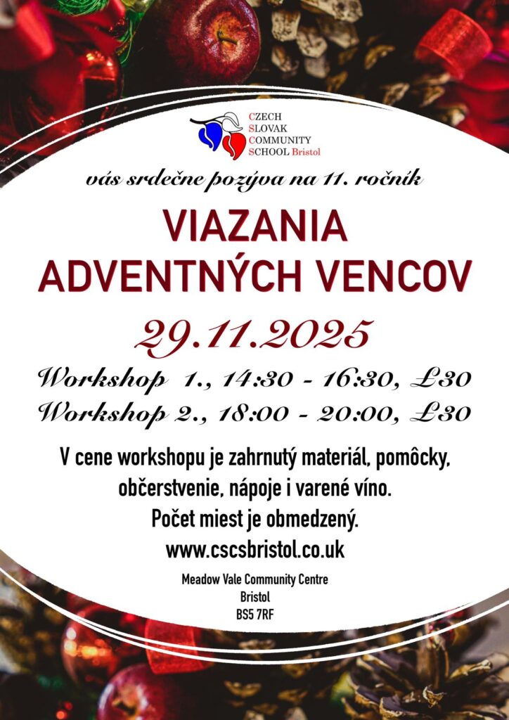 30. 11. 2024 Adventní věnce (workshopy) – Viazanie adventych vencov (14.30-16.30 nebo 18-20) v Meadow Vale Community Centre